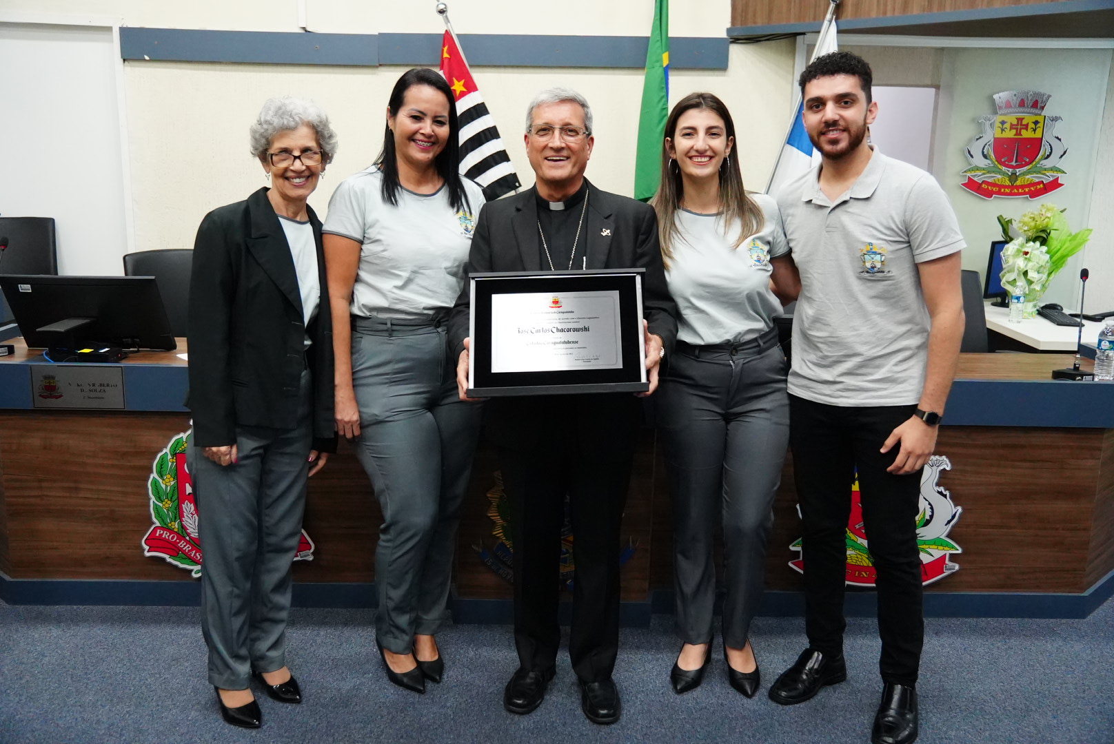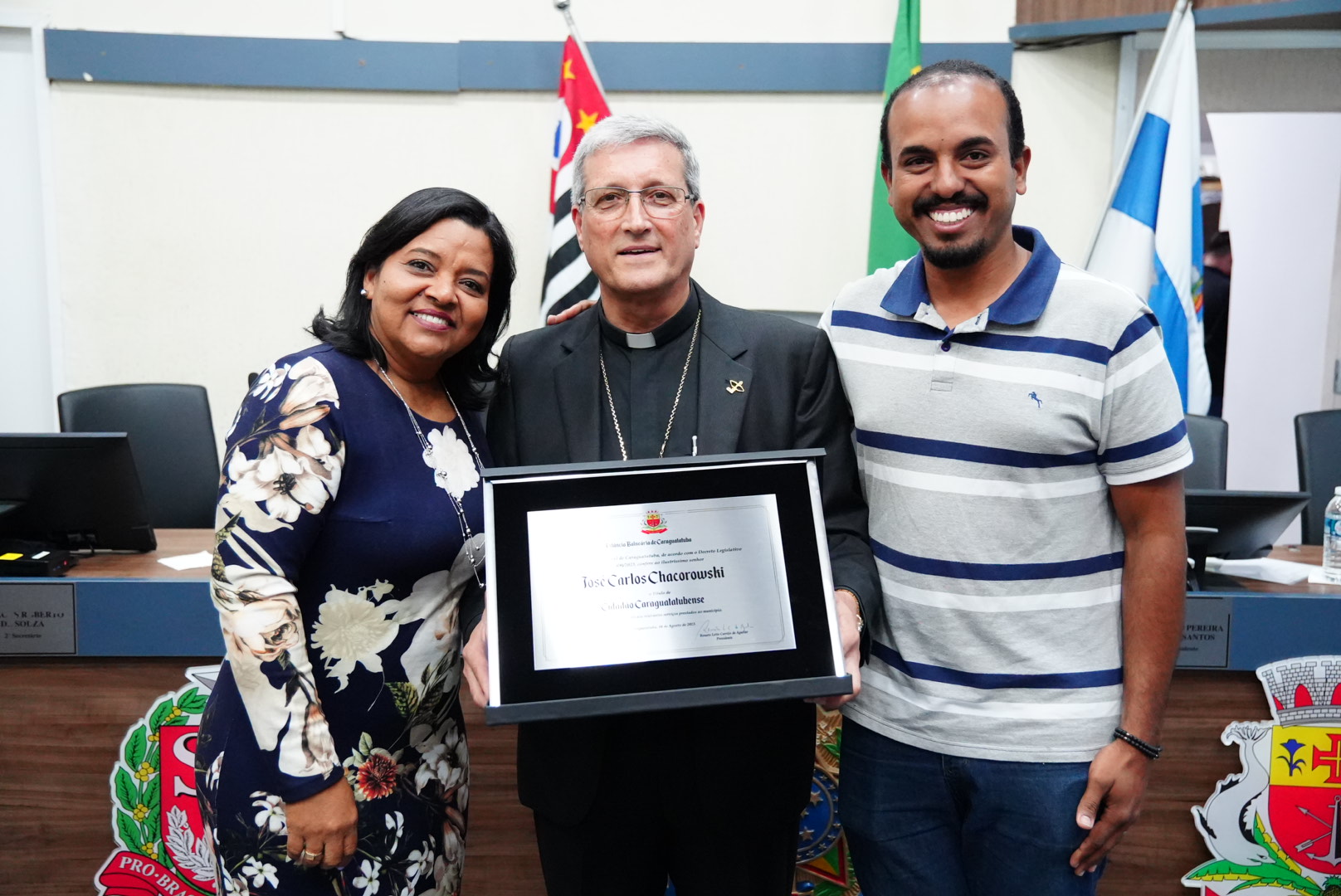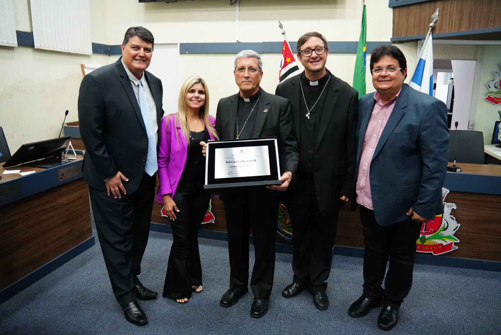 Com júbilo Dom José Carlos Chacorowski recebeu na noite de ontem (31), pelas mãos do Vereador Oswaldo Pimenta de Mello Neto (China), o título de Cidadão Caraguatatubense em Solene Sessão na Câmara Municipal. Estiveram na solenidade o Prefeito de Caraguatatuba Aguilar Junior, os Vereadores Jair, Cristian Bota e Tato Aguilar presidente da câmara, fiéis de nossa Diocese e parte de nosso Clero Diocesano.