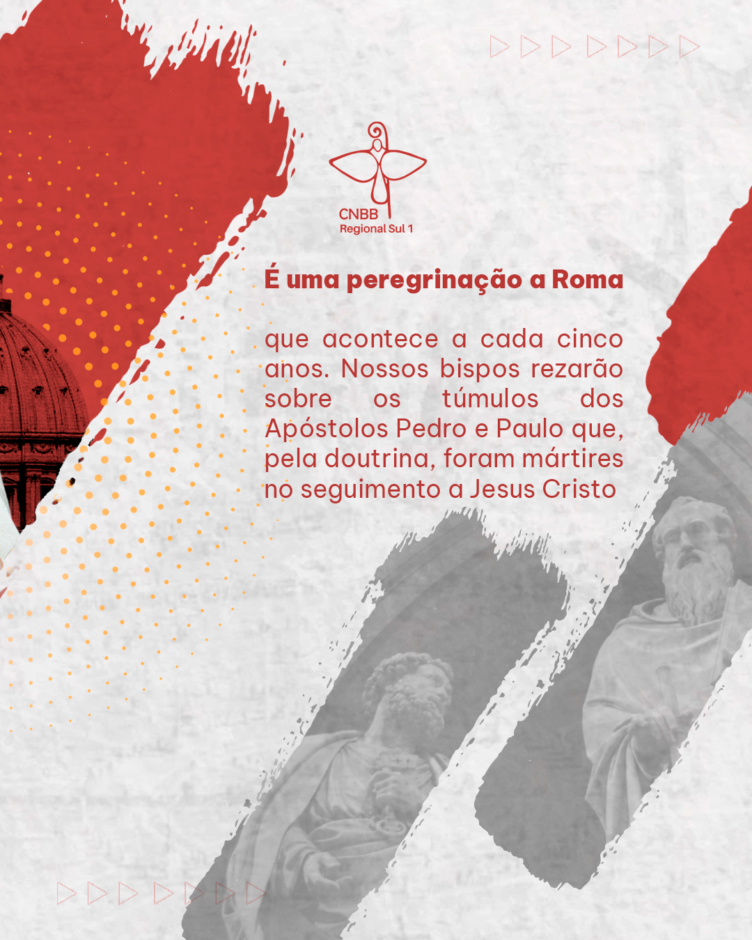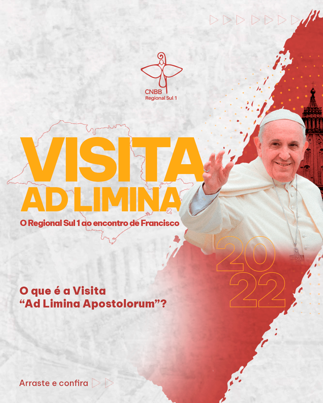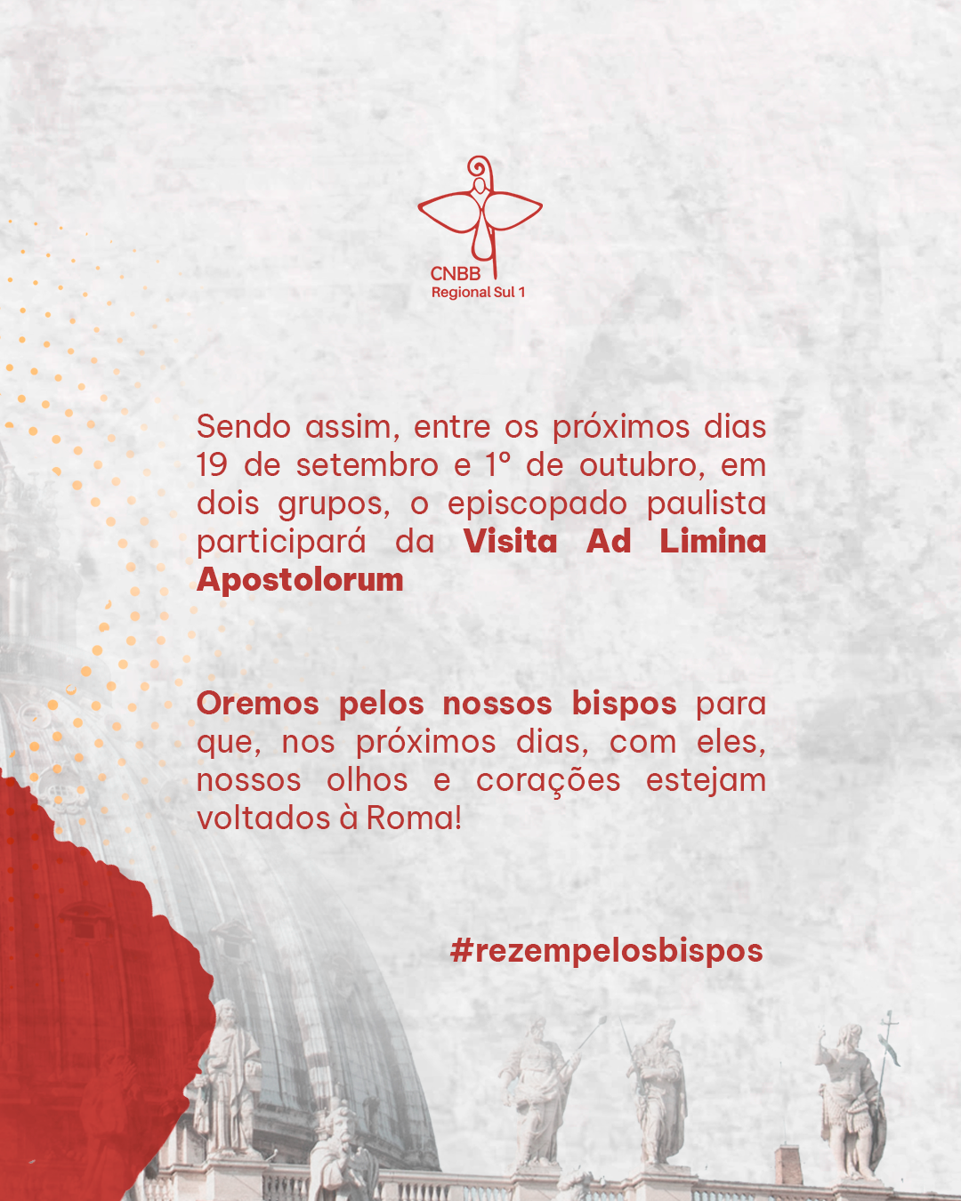 O Regional Sul 1 da Conferência Nacional dos Bispos do Brasil (CNBB), que compreende as arquidioceses, dioceses e eparquias do Estado de São Paulo, realiza, de 19 de setembro a 2 de outubro, a Visita ‘Ad limina Apostolorum’, uma peregrinação aos túmulos dos Apóstolos São Pedro e São Paulo, em Roma. Nosso Bispo Dom José Carlos Chacorowski participará da iniciativa pela primeira vez.