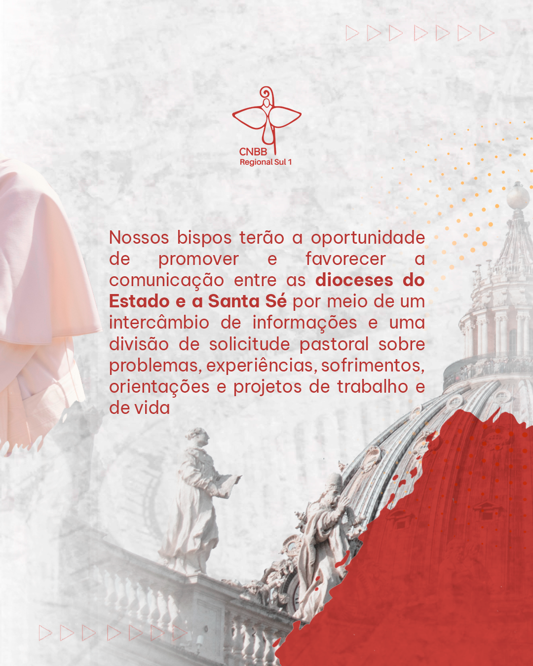 Segundo o Padre Tiago Barbosa, assessor da Pastoral da Comunicação (Pascom) do Regional Sul1, a viagem será uma oportunidade dos bispos de promoverem e favorecerem a comunicação entre as dioceses do Estado e a Santa Sé por meio de “um intercâmbio de informações e uma divisão de solicitude pastoral sobre problemas, experiências, sofrimentos, orientações e projetos de trabalho e de vida” (Introdução do Diretório da Visita Ad Limina, 1988).